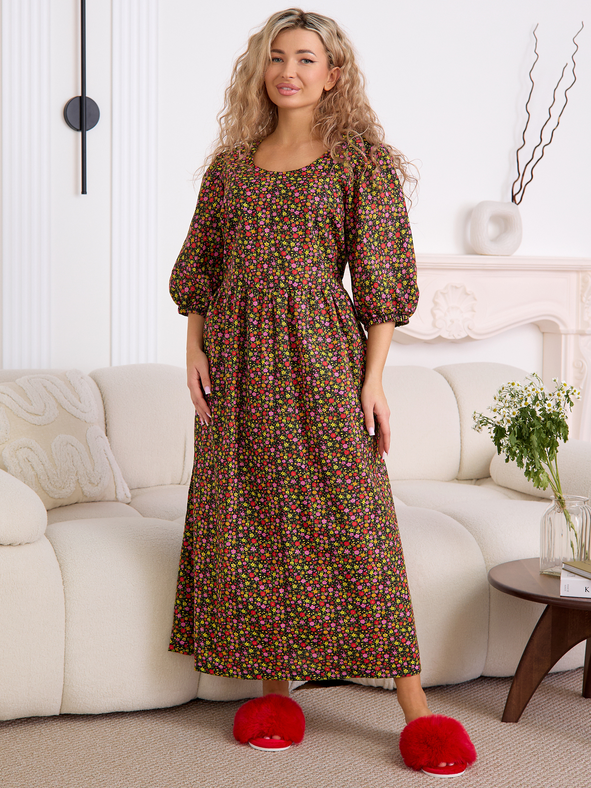 Рукав 3/4 с резинкой внизу — практичная и стильная деталь, которая завершает образ в духе «платья-крестьянки».